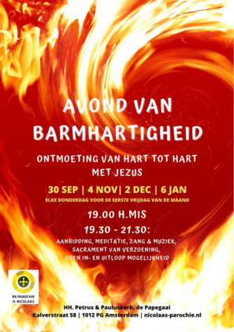 Op donderdag 30 september, 4 november, 2 december en 6 januari is er in De Papegaai een Avond van barmhartigheid. Die begint om 19:00 uur met een H. Mis. Aansluitend is er aanbidding met zang en lofprijzing. Ook is er biechtgelegenheid.Aanmelding vooraf is niet nodig. Wel wordt u dringend verzocht bij het betreden en het verlaten van de kerk een mondkapje te dragen. U kunt dit afdoen als u op uw plaats zit, en weer opzetten als u uw plaats in de kerk verlaat. Als u ter communie gaat, hoeft u uw mondkapje niet op te zetten.Passanten in de Kalverstraat nodigen we uit om in de kerk een lichtje aan te steken en hun intenties op te schrijven. De avond duurt tot 21:30 uur.Voor meer informatie, kijk op de website vande HH. Petrus en Pauluskerk (de Papagaai-kerk) in Amsterdam
