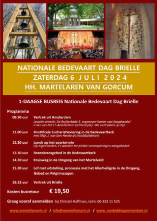 JaarlijkswordtmetdeNationaleBedevaartBrielle stilgestaanbijhetgetuigenisvandeMartelarenvan Gorcum.In1572werdennegentienRooms-katholieke geestelijkenuitGorcumgemarteldenopgehangenomdat zeweigerdenhungeloofindeHeiligeEucharistieafte zweren. Op 29 juni 1867 vond hun heiligverklaring plaats. Kosten busretour€ 19,50AanmeldenChristel Hoffman, telnr. 06 333 11 525. E-mail info@aanbiddingamsterdam.nl / info@avestellamaris.nlOpstapplaatsTegenover De Ruyterkade 5, Kamer van Koophandel Links van het Centraal Station (achterzijde)Meer informatiewww.AveStellaMaris.nl
