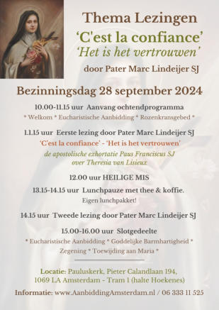 Voorganger en priesterPater Marc Lindeijer SJ, hij zal spreken over Theresia van Lisieux naar aanleiding van de apostolische exhortatievan Paus Franciscus JS. - Toelichting op de apostolische exhortatie- De apostolische exhortatie van Paus Franciscus SJBiechtgelegenheidGedurende de bezinningsdag is er gelegenheid om te biechtenLocatieSt. Pauluskerk, Pieter Calandlaan 194, 1069 LA AmsterdamOpenbaar vervoerTram 1 stopt nagenoeg voor de deur (halte Hoekenes)LunchGraag eigen lunch meenemen. Wij voorzien in koffie, thee, fris, koekje.FolderDownload HIER de folder van de bezinningsdag